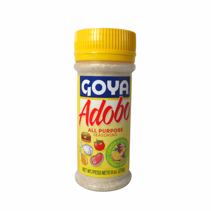 Goya Adobo assaisonnement saveurs citron et au poivre tout usage. C'est le mélange parfait d'épices latines, ce qui en fait un ingrédient idéal pour vos plats de légumes, de bœuf, de poulet ou de fruits de mer.